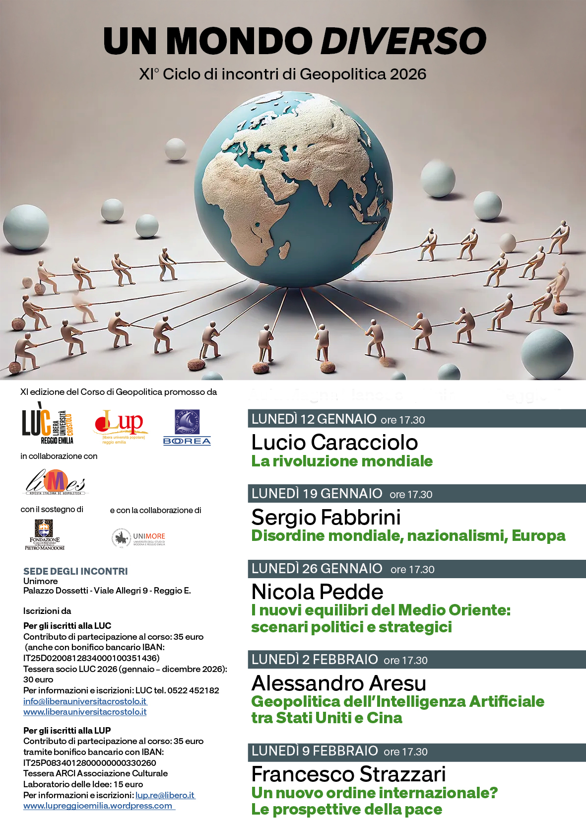 I Titoli delle conferenze sono di per sé significativi. Lucio Caracciolo ci parlerà di Rivoluzione Mondiale; Sergio Fabbrini di Disordine mondiale, nazionalismi, Europa; Nicola Pedde de I nuovi equilibri del Medio oriente: scenari politici e strategici; Alessandro Aresu di Geopolitica dell’intelligenza artificiale tra Stati Uniti e Cina e Francesco Strazzari di Un nuovo ordine internazionale? Le prospettive della pace.